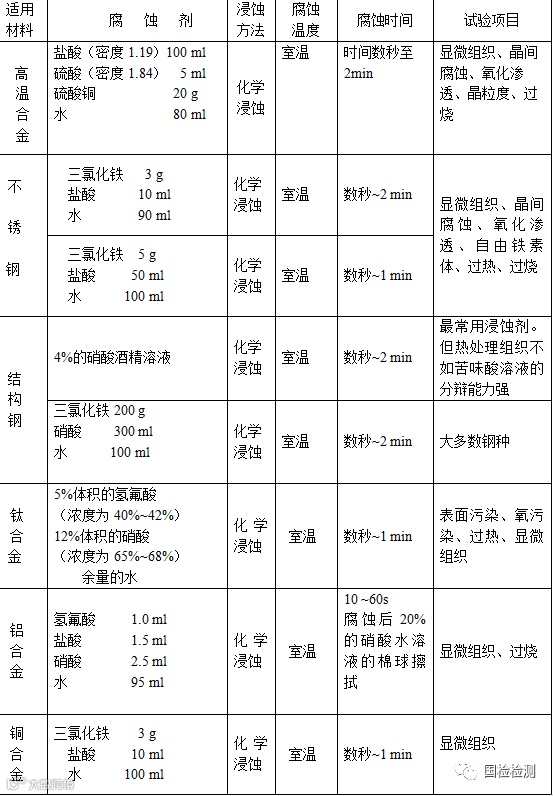 金属材料(高温合金、不锈钢、结构钢、钛合金、铝合金、铜合金),室温下进行金相组织检查时,最常用的腐蚀剂配方如下表。