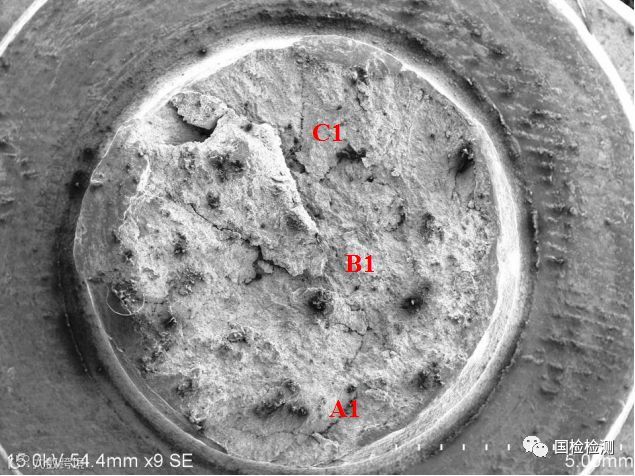 选取1#、2#螺栓断口进行观察分析。图2所示为1#螺栓断口宏观形貌,断面粗糙,无明显塑性变形,断口未发现明显的腐蚀现象。将断口分为A1、B1、C1三个区域进一步描述。
