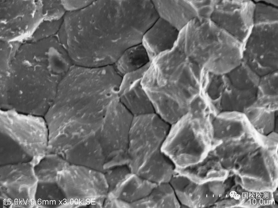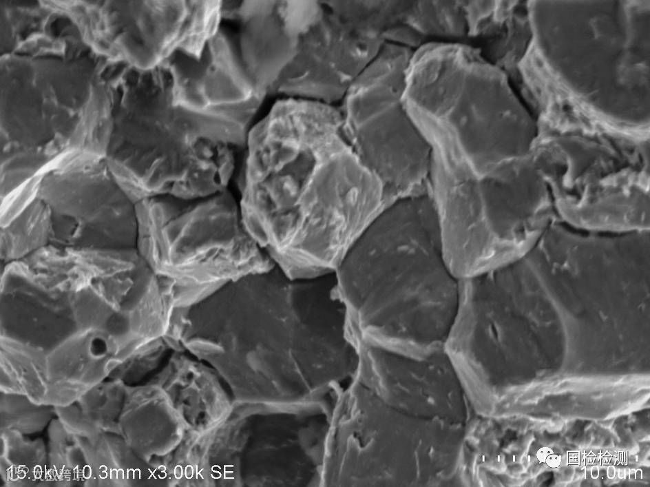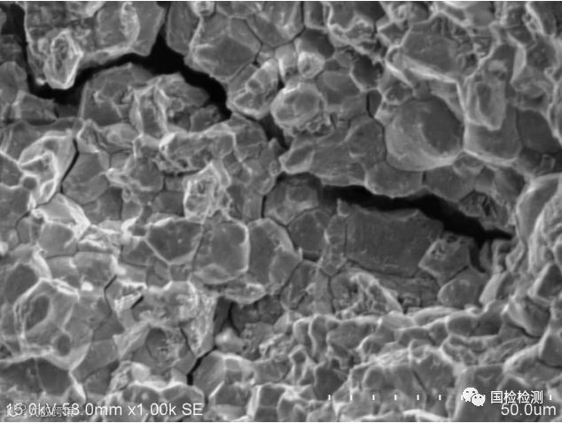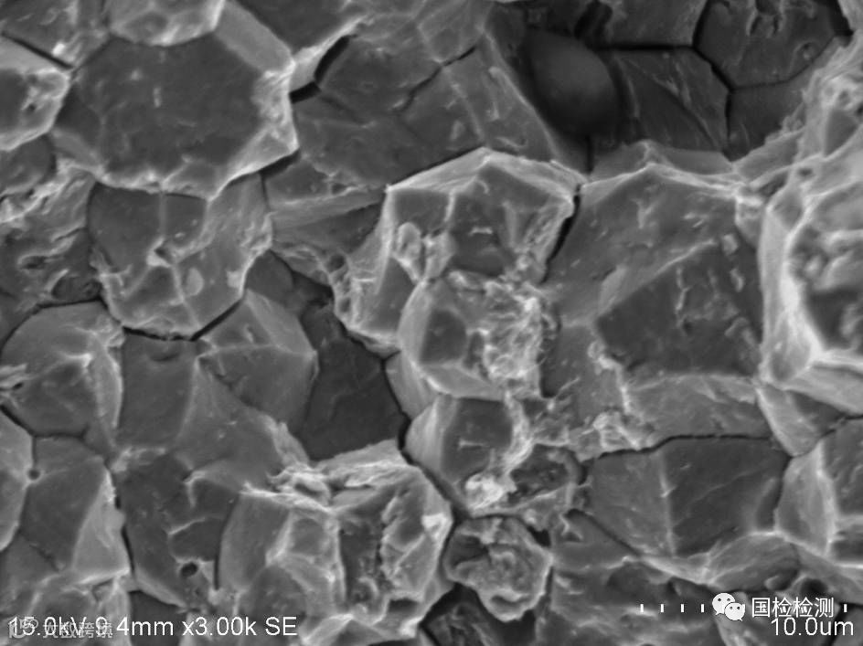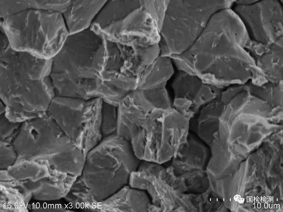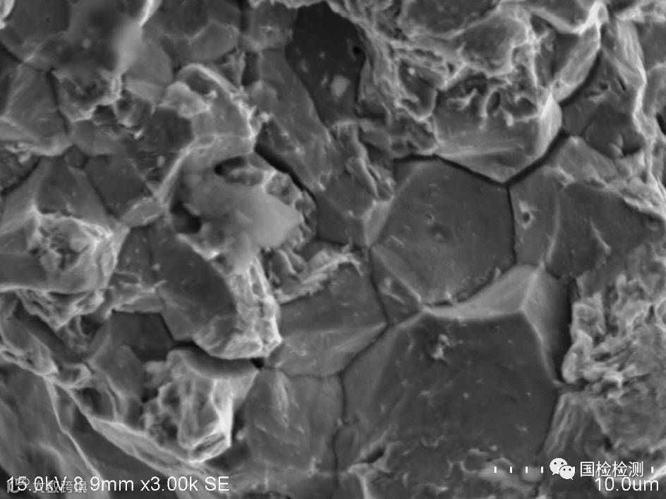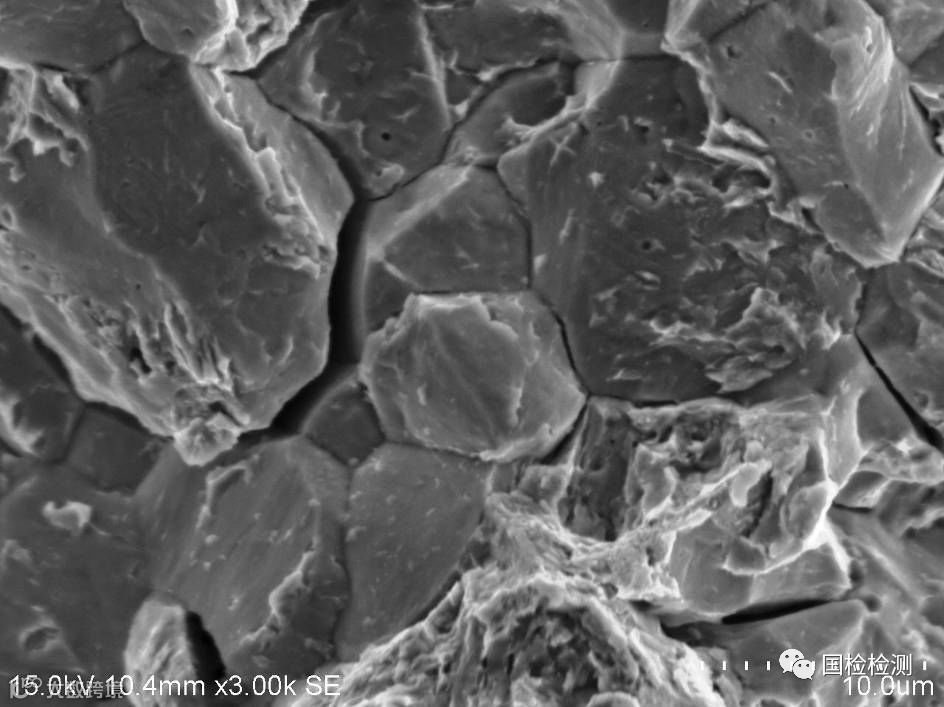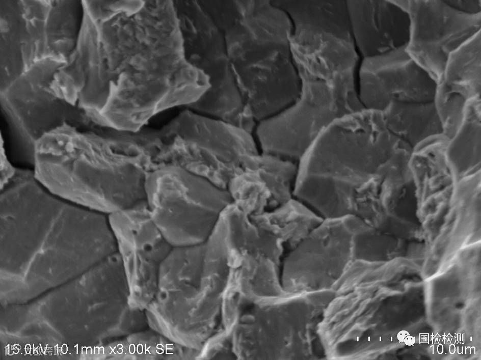 螺栓抗拉强度、表芯硬度、显微组织、表面増碳、偏析、化学成分等均未发现异常。断口形貌显示,断面可见大面积明显的冰糖状沿晶断裂形貌,晶面存在“鸡爪纹”特征,并伴有晶间二次裂纹,符合氢脆断裂形貌特征。据委托方反映,失效螺栓为车辆行驶短里程即发生断裂,具有延迟断裂特点,因此判断螺栓失效模式为氢致延迟断裂,即氢脆。
