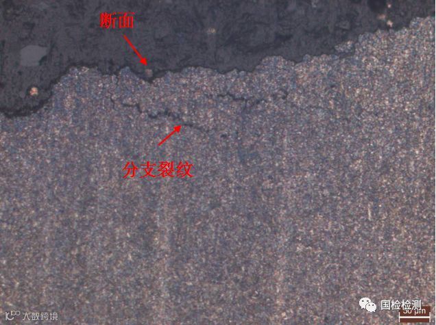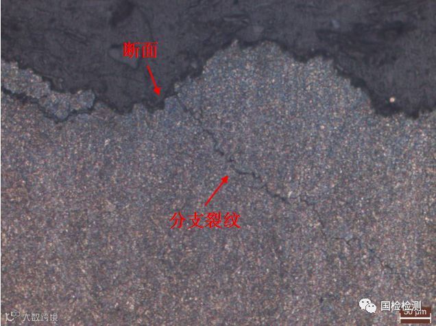 垂直2#螺栓断面截取纵向试样进行金相观察。图21所示为断面附近金相组织,可见断面附近存在明显的沿晶分支裂纹,断面及分支裂纹两侧均未发现明显的脱碳或増碳现象。