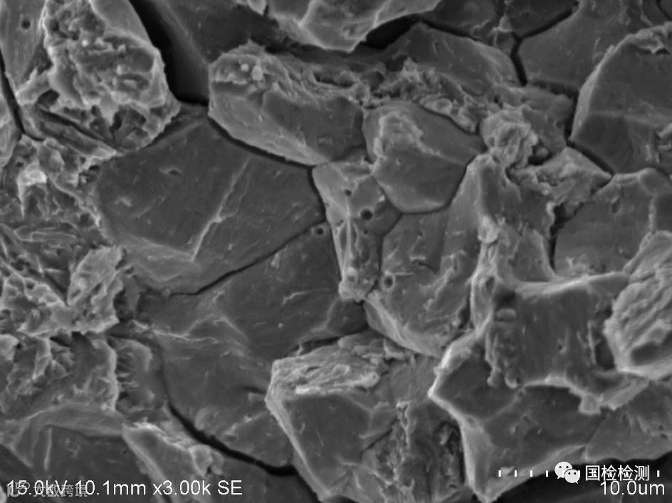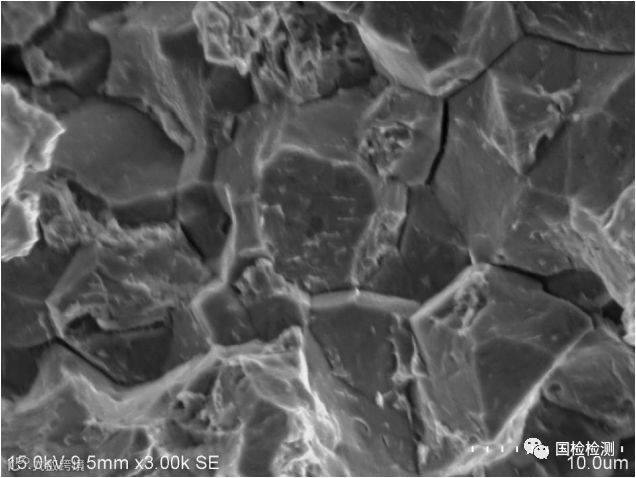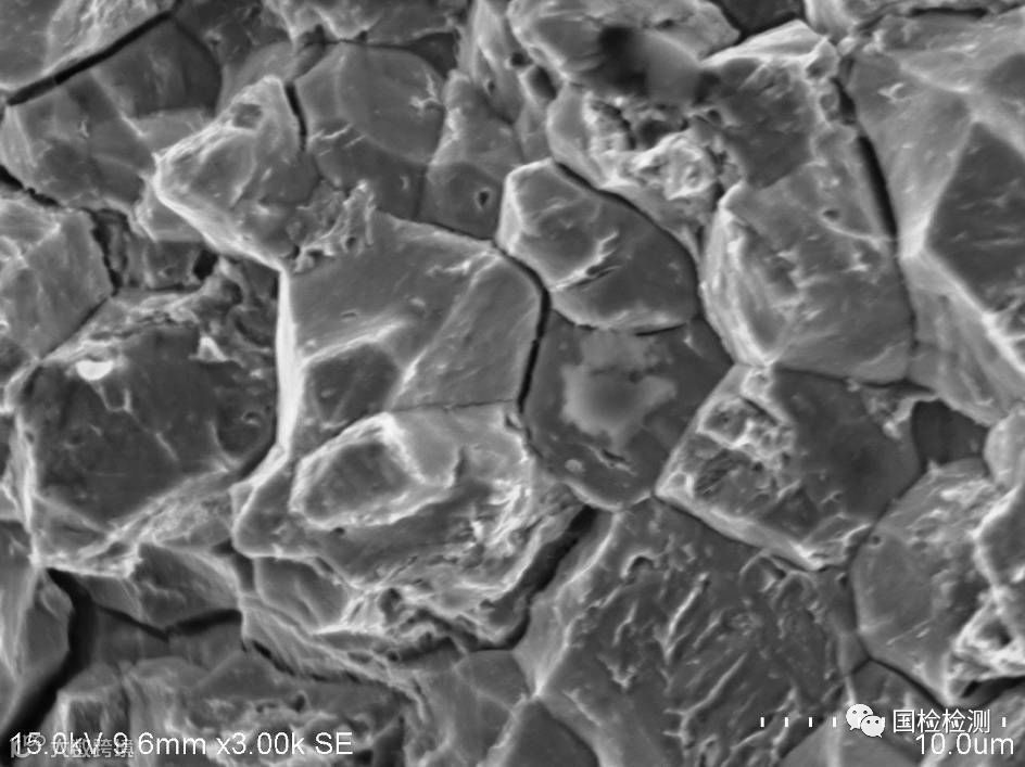 图10、图11所示为A2区微观形貌,可见明显的“冰糖状”沿晶形貌,晶面可见“鸡爪纹”,并伴随晶间二次裂纹。