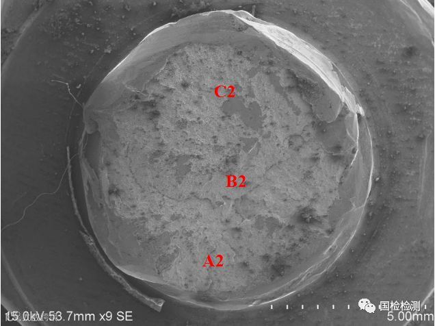 图9所示为2#螺栓断口宏观形貌,断面粗糙,无明显塑性变形,断口存在明显的磕碰损伤痕迹,未发现明显的腐蚀现象。将断口分为A2、B2、C2三个区域进一步描述。