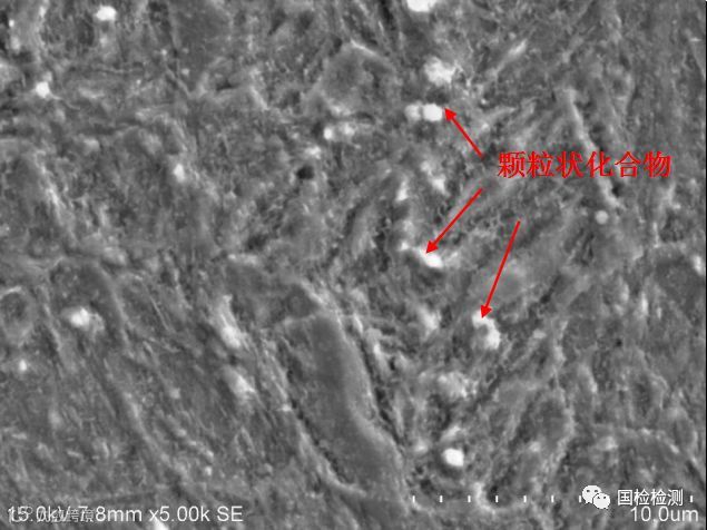 将经过4%硝酸酒精腐蚀后的试样放入扫描电镜,对显微组织进行观察。图26、图27所示为1#螺栓显微组织电镜形貌,可见明显的颗粒状化合物(箭头所示)及弥散分布的点状碳化物,经能谱分析(见图28),颗粒状化合物主要为碳化物(Pt元素为喷金过程带入,可忽略)。