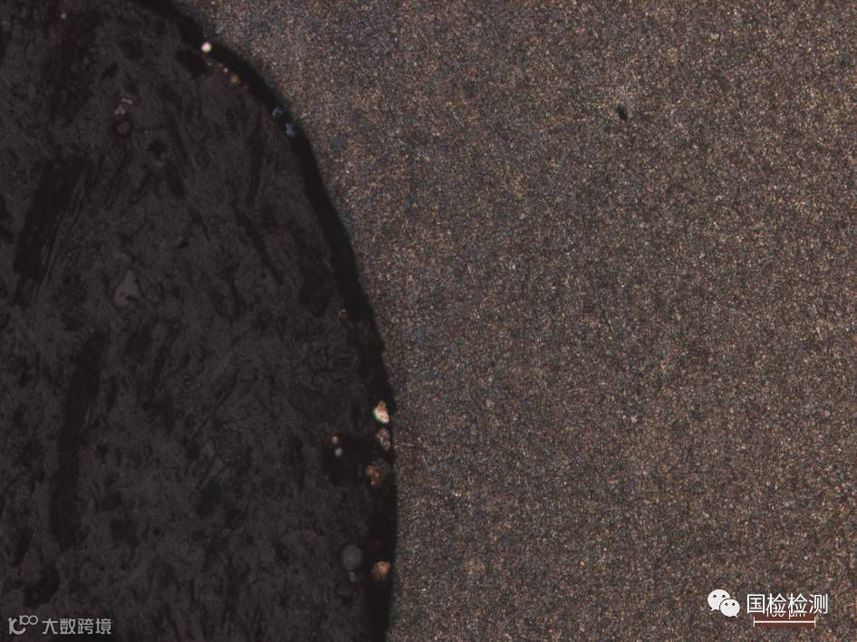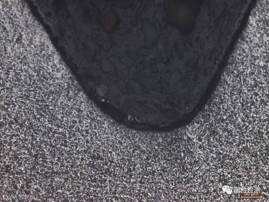 截取未断裂完好螺栓纵截面进行金相观察,图31所示为螺纹收尾处金相组织,可见螺纹收尾处圆弧过渡,牙底未发现明显折叠、裂纹等不连续性缺陷(见图32)。