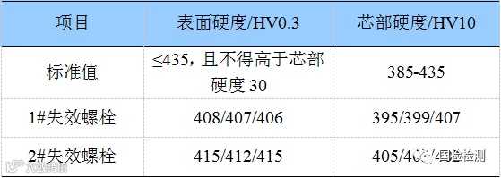 对两枚失效螺栓分别进行表芯硬度检测,结果如表1所示,均符合“GB/T 3098.1-2010”标准中关于12.9级螺栓的规定。