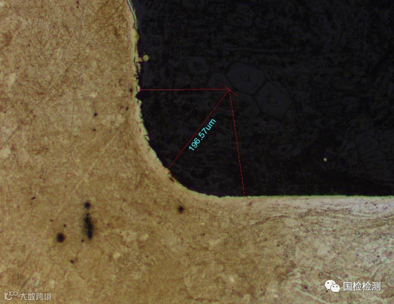 断口相邻圆角处的金相组织检查,可见圆角半径约0.2mm,见图11-126所示。
