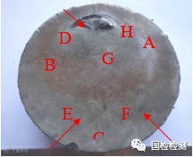 对断口检查,可见整个断面基本平整,与轴向垂直,附近无明显塑性变形痕迹,断面宏观形貌如图11-115所示。为便于进一步观察,将断面分为A、B、C、D、E、F、G、H八个区域进行描述