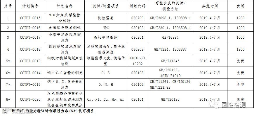 2019年能力验证项目开始啦~本批能力验证计划包括紧固件拉伸,金属材料硬度,金相和化学成份。具体项目及详细信息如下: