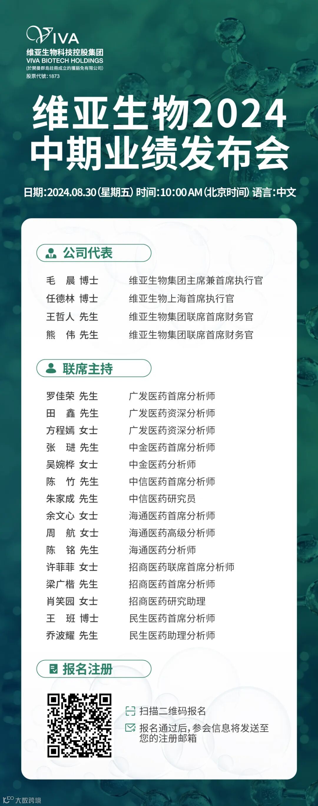 我们诚挚邀请您参加将于2024年8月30日召开的维亚生物2024中期业绩发布会。