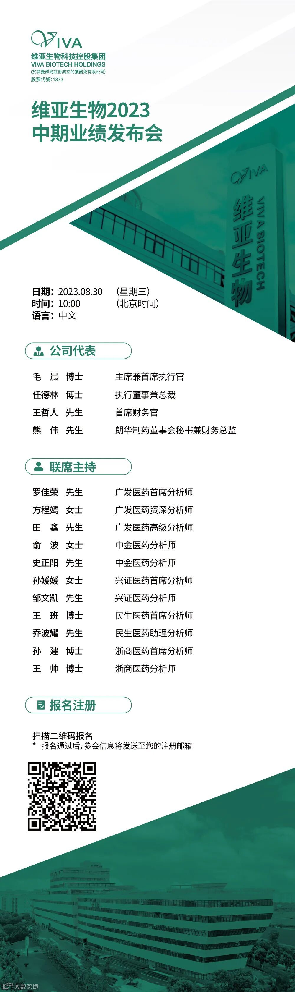 我们诚挚邀请您参加将于2023年8月30日召开的维亚生物2023中期业绩发布会。