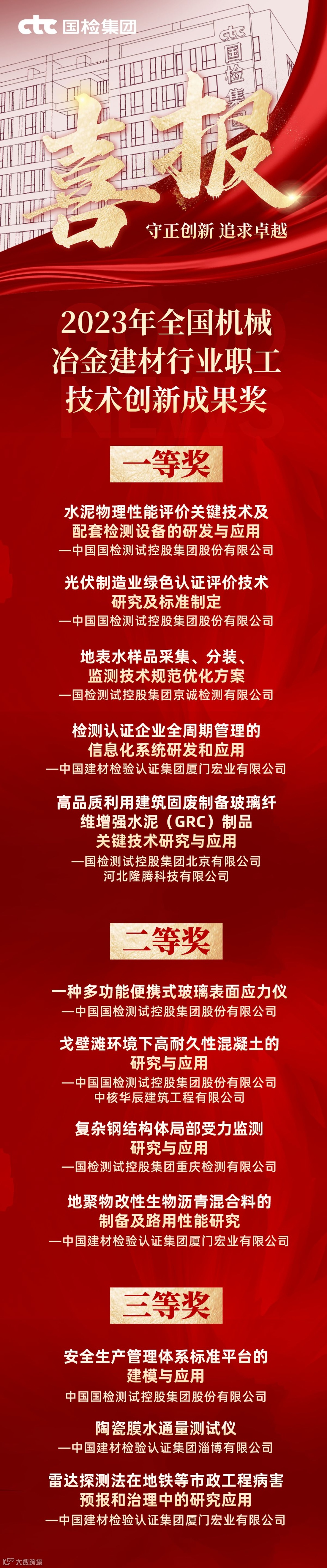 近日,中国机械冶金建材职工技术协会发文通报,国检集团12个项目荣获2023年全国机械冶金建材行业职工技术创新成果奖,其中5个项目荣获一等奖,4个项目荣获二等奖,3个项目荣获三等奖。国检京诚集团“地表水样品采集、分装、监测技术规范优化方案”荣获一等奖。