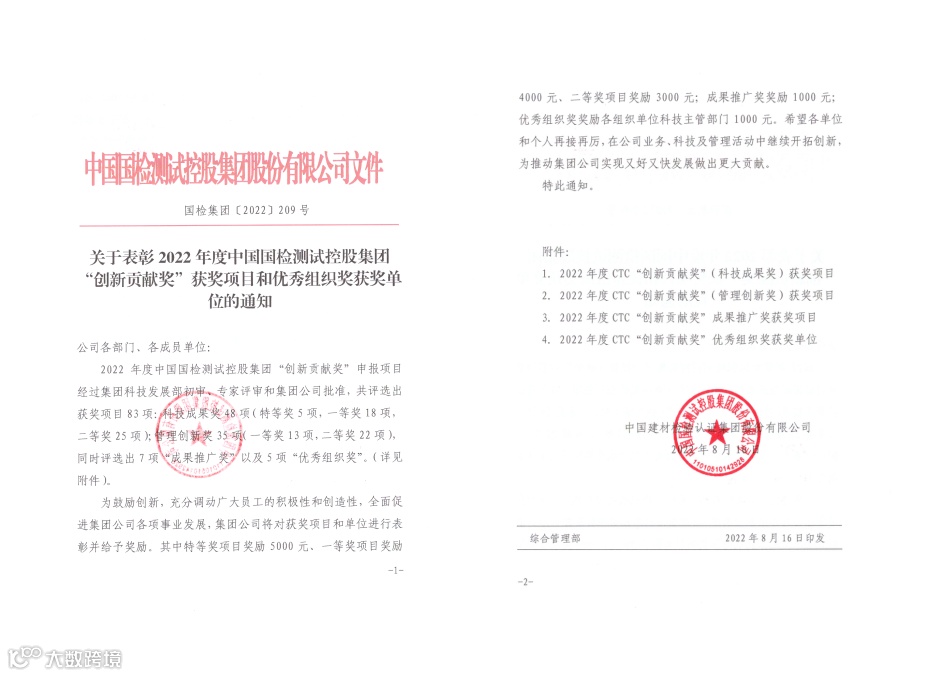 近日,中国国检测试控股集团公布了2022年度“创新贡献奖”获奖项目,国检京诚集团表现突出,共获科技成果奖1项、管理创新奖5项(其中一等奖1项)以及成果推广奖1项。此外,参与中国国检测试控股集团EHS事业部两项项目,分别获得科技成果一等奖和二等奖。