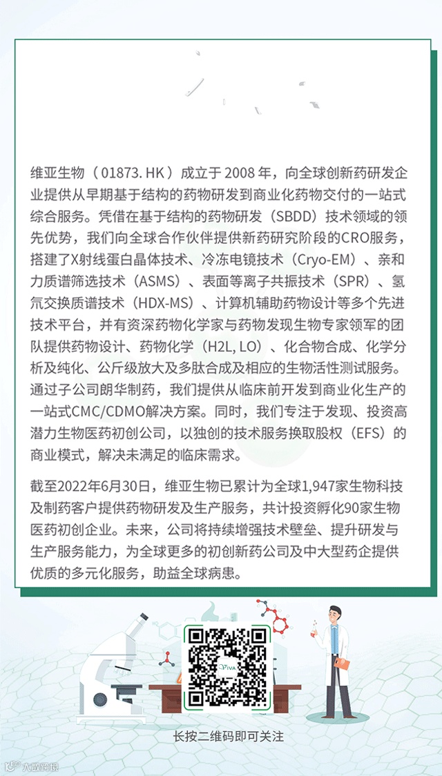 此研究是由生物医药初创企业、高等院校和CRO公司合作的一项成功案例。维亚生物作为全球领先的一站式CRO-CDMO服务企业,自2020起与投资孵化的Elgia Therapeutics展开紧密合作,提供了化学合成,蛋白制备和结构分析以及SPR研究等服务,为研究提供了有力的科学论证支持。本次研究成果的成功发表,也体现了维亚专业的研发能力和全面的服务能力。