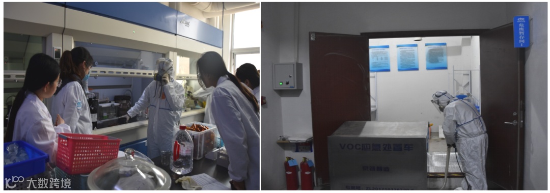 突发环境事件应急演练主要包括实验室使用危险品盐酸泄漏、乙腈泄漏、实验室有机废液泄漏三方面的演练。在无机前处理室模拟了实验过程中危险废物盐酸泄露的处置,“泄露”发生后,实验人员立即使用砂土对泄露进行处理,泄露情况得以控制;在有机前处理室模拟了实验过程中危险废物乙腈泄露的处置,“泄露”发生后,实验人员立即使用活性炭对泄露进行处理,泄露情况得以控制;在公司危险废物暂存间模拟了有机废液泄露的处置。“泄露”发生后,公司立即启动应急预案,使用公司自制的实用新型发明VOC应急处置车对有机废液进行收集处理,控制“泄露”。