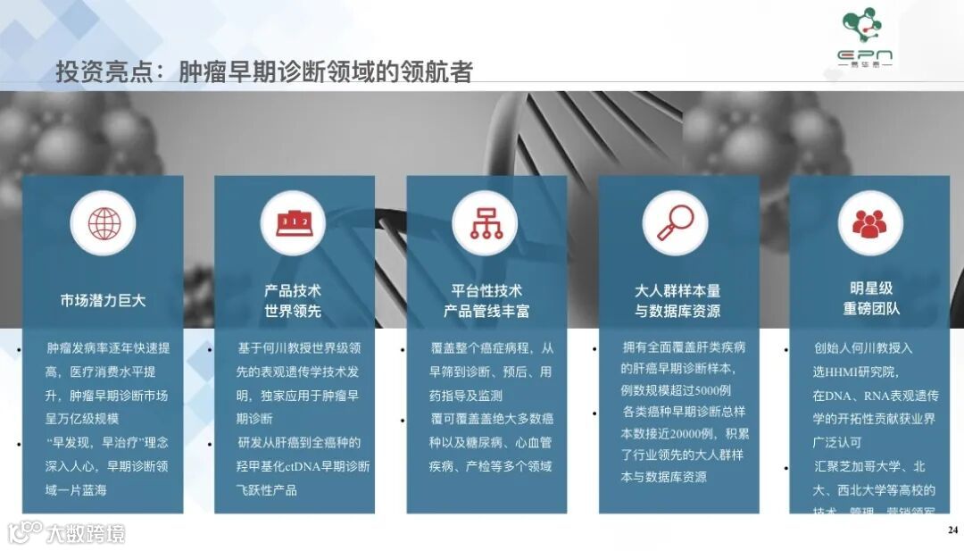 “易毕恩专注于肿瘤表观遗传诊断技术的研发,其甲基化和羟甲基化捕获、测序和分析方面的技术开发,目前共获得独占许可的美国芝加哥大学甲基化和羟甲基化专利4项,申请国内发明专利10项,其中1项已授权,2项已提交美国专利申请,具有很高的专利护城河。”
