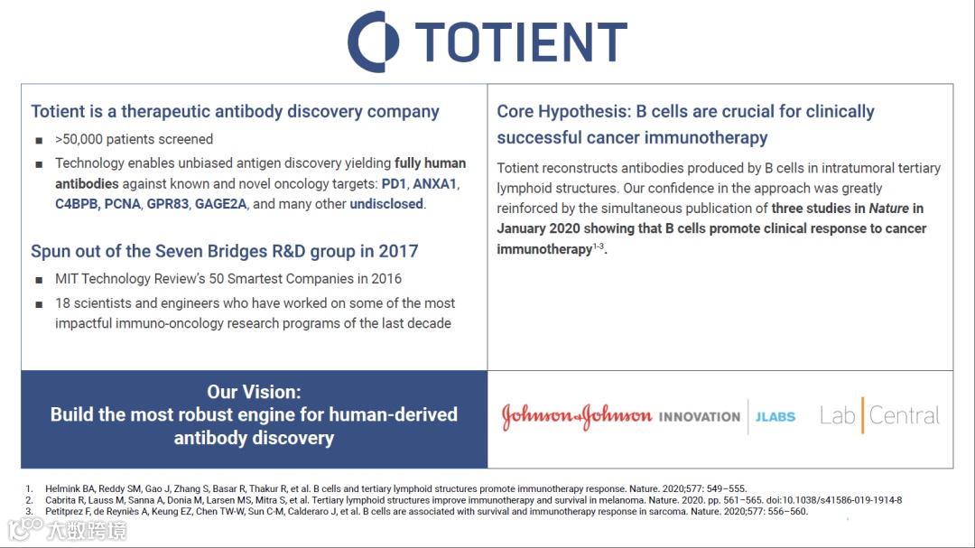 “Totient独有从肿瘤组织数据库进行虚拟筛选抗肿瘤抗体药物的平台,其创新思维颠覆了现有的高度同质化的抗体平台。公司通过前期虚拟筛选已获得数百个Hits,并正在对Hits进行体内、体外功能鉴定。基于独特的筛选机制,其寻找到的抗体有望具备更高的成药性。”