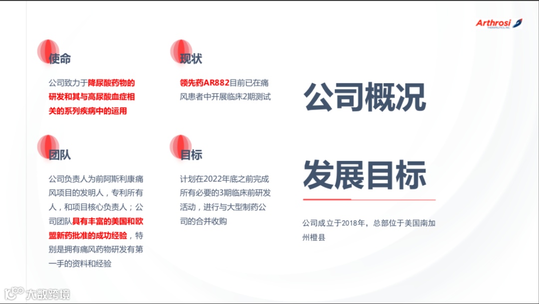 “Arthrosi致力于开发治疗痛风等代谢类疾病的创新药物。产品AR882目前在Phase 2a,它是新一代尿酸排泄促进剂,已经在痛风病人中观察到了优异的药效。AR882克服了上市药物的缺点,能够与尿酸转运蛋白长效结合,延长抑制作用的时间,临床结果显示其药效长达24小时,有潜力取代当前药物而成为一线用药。”