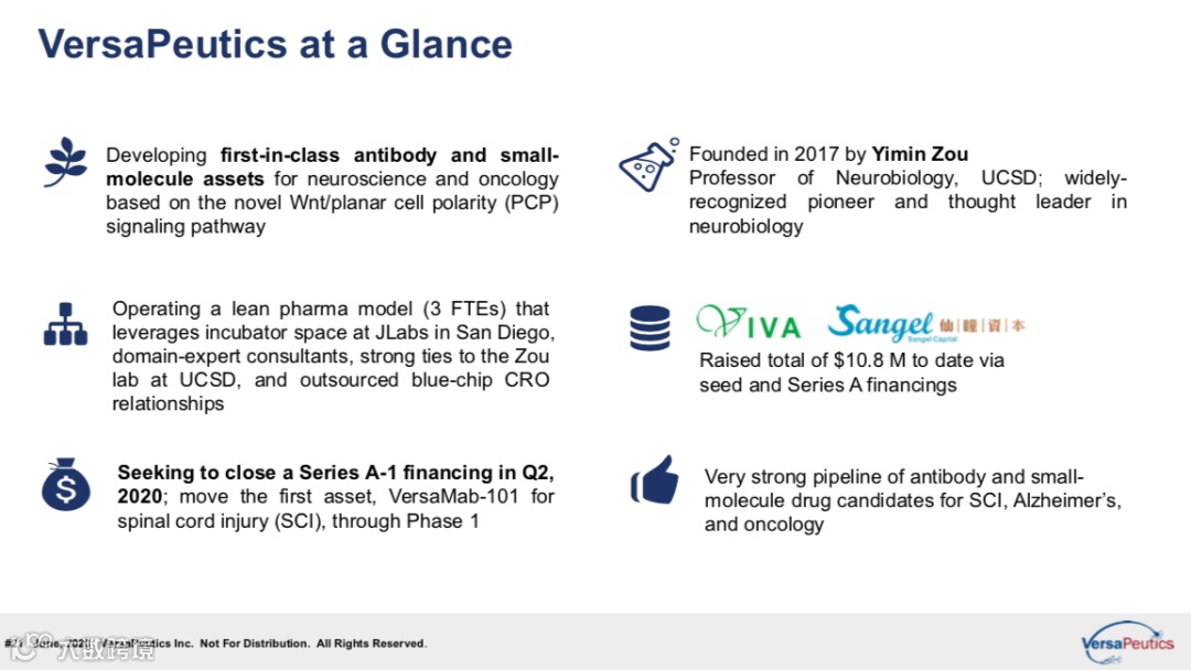 “基于全新的wnt/pcp信号通路,VersaPeutics致力于研发针对中枢神经系统疾病和癌症的抗体和首创小分子药物。VersaPeutics的第一个项目VersaMab-101应用于脊髓损伤,通过轴突生长以达到治疗急性脊髓损伤的效果。目前FDA尚未批准任何一款治疗脊髓创伤的药物,据测算仅在美国,脊髓损伤的市场潜力就高达200亿美元/每年。VersaPeutics 同时推进First-in-class 老年痴呆和肿瘤的抗体和小分子药物。”
