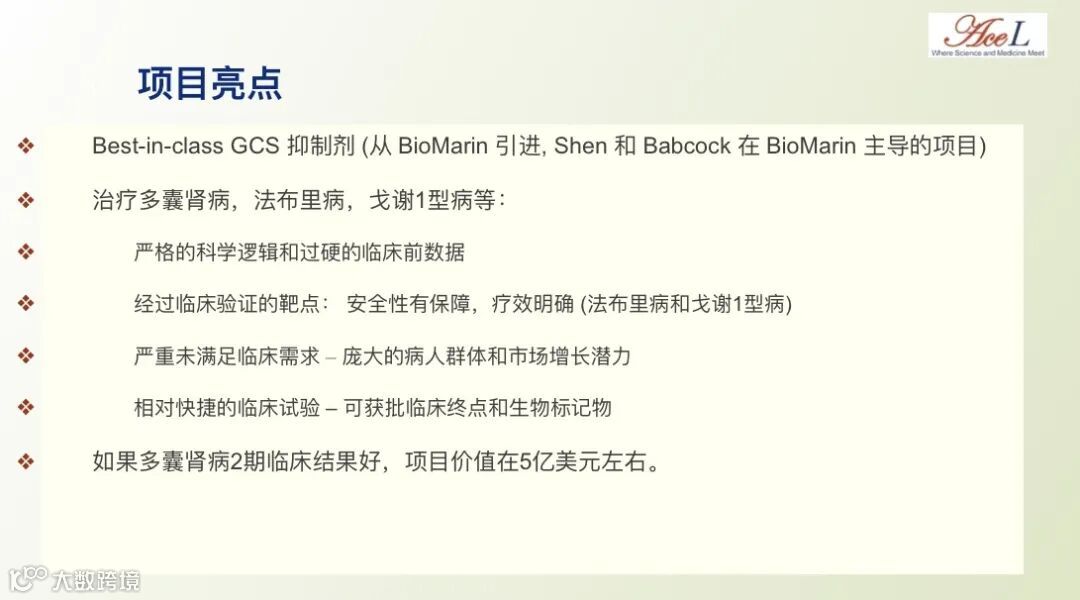 “AceLink Therapeutic致力于开发人类遗传相关疾病的首创新药和最佳新药。公司主推药物候选分子AL01211为小分子GCS 抑制剂,可用于治疗多囊肾病 (PKD)。多囊肾为最常见的遗传性肾病,全球有约1200万患者,治疗方法十分有限,是一项严重未满足的临床需要。AL01211新药申报临床前工作正在进行中,预期2020年第四季度完成新药注册申报。”