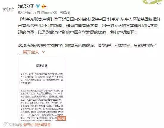 120多位科学家通过《知识分子》杂志官方微博发布联合声明,表示“这项所谓研究的生物医学伦理审查形同虚设。直接进行人体实验,只能用疯狂形容。作为生物医学科研工作者,坚决反对!强烈谴责!”