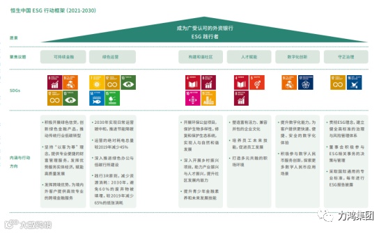 搭建ESG行动框架:恒生中国搭建了“ESG行动框架(2021-2030)”,设立了未来十年ESG领域的主要关注议题(如:可持续金融、绿色运营、社区、员工、治理等),并对标SDGs,提升企业行动框架的影响力和权威性。