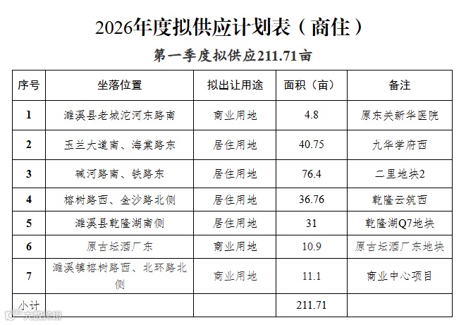 2026年3月13日,濉溪县自然资源和规划局正式发布《2026年度拟供应计划表》,全年计划供应商住用地944.8亩,分四个季度有序推出。