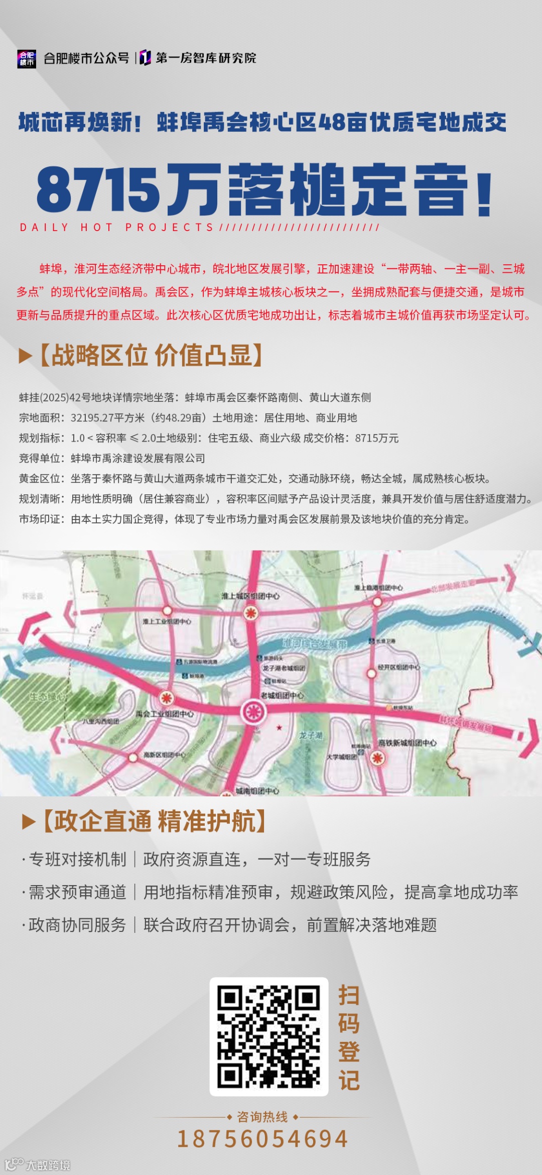 这块编号蚌挂(2025)42号的宗地,坐落于禹会区秦怀路南侧、黄山大道东侧,规划为居住、商业用地,出让面积32195.27平方米(约48.293亩)。根据公示信息,该地块容积率控制在1.0到2.0之间,土地级别为住宅五级、商业六级,出让年限为居住70年、商业40年。值得一提的是,该地块采用挂牌方式出让,保证金1729万元,最终成交价8715万元,充分体现了市场对禹会区发展潜力的高度认可。
