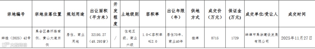 2025年11月27日,蚌埠市土地市场迎来又一重要时刻——禹会区秦怀路南侧、黄山大道东侧一宗编号为蚌挂(2025)42号的优质住宅用地以8715万元成功出让,竞得方为蚌埠市禹涂建设发展有限公司。