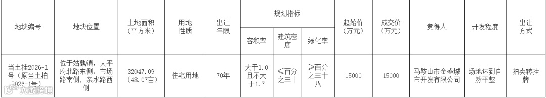 地块起始价1.5亿元,最终成交价与起始价持平,由马鞍山市金盛城市开发有限公司竞得。出让方式经历波折:最初计划以拍卖方式出让,但因截至2026年1月26日16时竞买人不足三人,转为挂牌方式出让。挂牌时间为2026年1月27日8时至2026年2月6日16时,地点为当涂县公共资源交易中心。