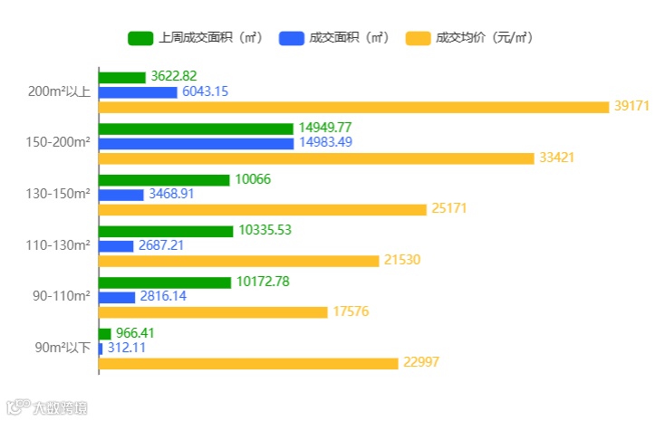 从成交面积段来看,本周成交面积段150-200m²以上的占比最大。