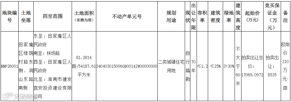 五、拍卖时间和地点:本次国有建设用地使用权拍卖会定于2026年2月6日16:00在淮南市公共资源交易中心一楼开标四室(山南新区政务中心F楼)举行。
