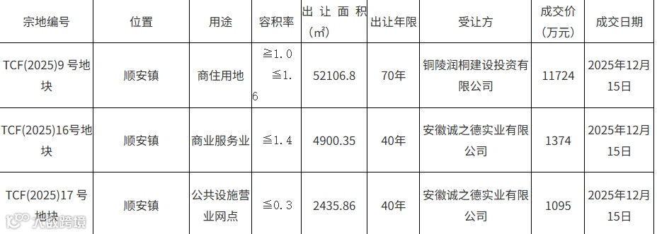 按照《中华人民共和国土地管理法》、《中华人民共和国城市房地产管理法》、《招标拍卖挂牌出让国有土地使用权规定》和《招标拍卖挂牌出让国有土地使用权规范》等有关法律法规,遵循公开、公正、公平的原则。铜陵市自然资源和规划局(林业局)义安区分局于 2025年12月15日挂牌出让了三宗国有建设用地使用权。现将有关情况公示如下: