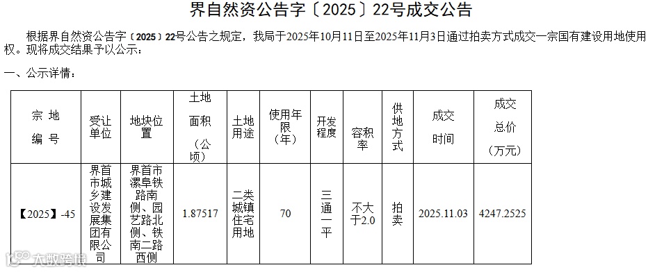 2025年11月04日,界首市自然资源和规划局发布公告,成功以拍卖方式成交一宗编号为【2025】-45的二类城镇住宅用地,为年末的土地市场增添了一抹亮色,也预示着城市发展的持续活力。
