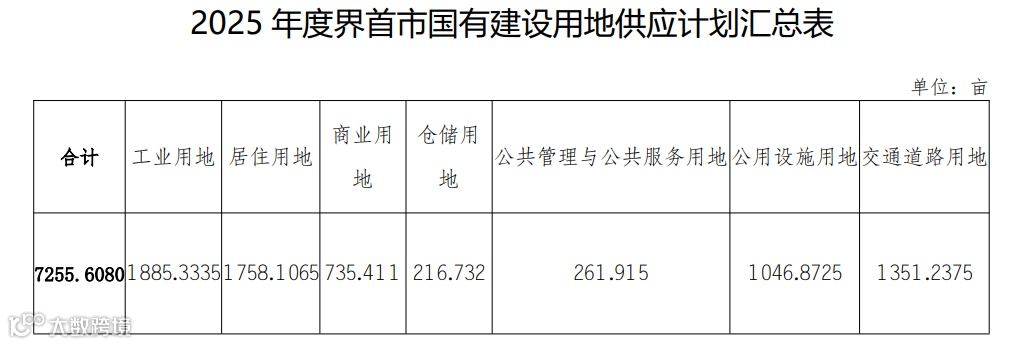此次成交的【2025】-45地块,位于界首市漯阜铁路南侧、园艺路北侧、铁南二路西侧,土地面积约1.875公顷(约28.13亩),规划为二类城镇住宅用地,容积率不大于2.0,最终由界首市城乡建设发展集团有限公司竞得。回顾《2025年度界首市国有建设用地供应计划》,全年计划供应国有建设用地总量约7255.6亩,其中居住用地计划供应1758.11亩,占比24.23%,是各类用地中供应量第二大的类型。