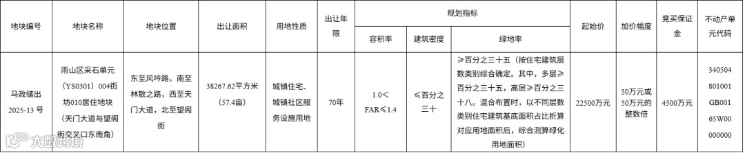 5.本次拍卖出让交纳土地竞买保证金的截止时间为2025年11月13日16时,缴纳竞买保证金须全额缴纳至专户,保证金以实际到账时间为准。经审查,申请人报名申请及保证金到账情况符合该宗地申请条件的,马鞍山市公共资源交易监督管理局将在2025年11月14日17时前确认竞买资格,并通过马鞍山市国有建设用地使用权网上交易系统通知竞买人。