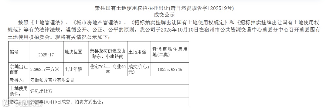 2025年10月10日,萧县自然资源和规划局发布《国有土地使用权招拍挂出让成交公示》(萧自然资规告字[2025]9号),一宗编号为2025-17的优质地块以10335.68745万元成功出让,竞得人为安徽领匠置业有限公司。此次成交不仅标志着萧县土地市场稳步推进,更折射出县域经济高质量发展的强劲动能。作为2025年萧县国有建设用地供应计划中的重要一环,该地块的落地将为区域人居品质提升和城市空间优化注入新活力。