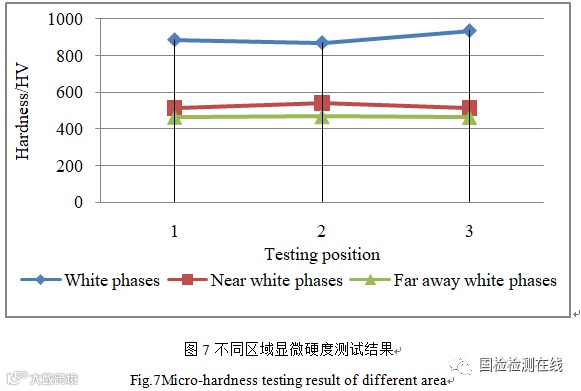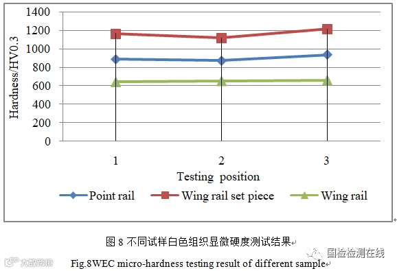 图7为心轨WEC及附近基体显微硬度测试结果,WEC显微硬度平均值约为HV 897,裂纹附近基体显微硬度平均值约为HV 522,远离裂纹处的基体显微硬度平均值约为HV 465。可见WEC硬度明显高于附近基体和远端基体,附近基体的硬度略高于远端基体,因此附近基体对应过渡区。图8为不同试样WEC的显微硬度测试结果,可见翼轨镶块的WEC的显微硬度(平均值约HV 1165)最高,心轨的白色组织显微硬度(平均值约HV 897)次之,翼轨的WEC的显微硬度(平均值约HV 651)最低。