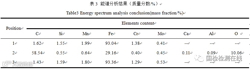 图6为心轨WEC组织及附近基体的能谱分析位置,分析结果见表3,翼轨镶块和翼轨对应位置的能谱分析结果与心轨一致。能谱分析结果表明:WEC(位置3)和基体(位置1)不仅元素组成相同,主要含Fe、Mn、Si、Cr等金属元素,且元素含量相近,由于能谱分析方法对轻元素(原子序数为9以前的元素)分析误差较大,因此实测C含量与材料本身C含量相差较大;裂纹内(位置2)C元素含量较高,为镶嵌料填充物,此外还存在Fe的氧化物。WEC的成分与基体无明显差异,再次说明其与文献[8]描述相符,为基体因局部产生高温再冷却产生马氏体相变,形成碳的过饱和固溶体,因此成分与基体无异。