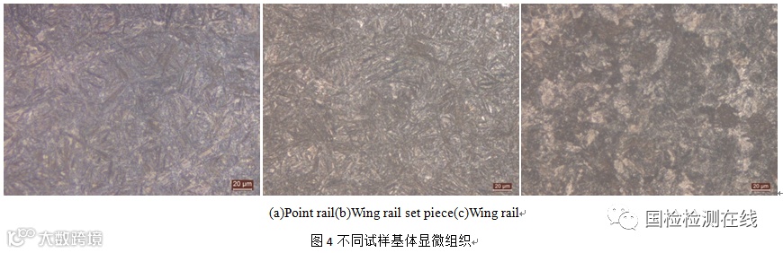 图2为心轨试样经4%硝酸酒精溶液腐蚀后的显微组织形貌,可见裂纹不同位置均存在WEC组织,该组织不是一个连续的整体,而是被微裂纹分割成大小不一的小块,尺寸与基体组织相近,WEC组织内未见其它明显组织结构特征,WEC与基体之间无明显过渡区,附近基体显微组织为针状贝氏体。图3为翼轨裂纹断口金相组织,同样在源区附近发现WEC组织。图4为不同试样的基体显微组织,心轨和翼轨镶块的组织相近,均为针状贝氏体(图4a和图4b),翼轨组织为细珠光体+少量铁素体(图4c),未见标准“TB/T 2344.1-2020”中规定的马氏体、贝氏体及晶界渗碳体等异常组织。