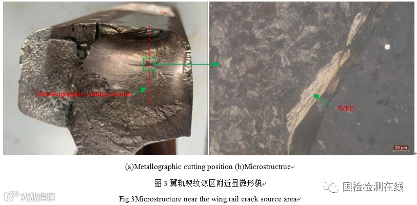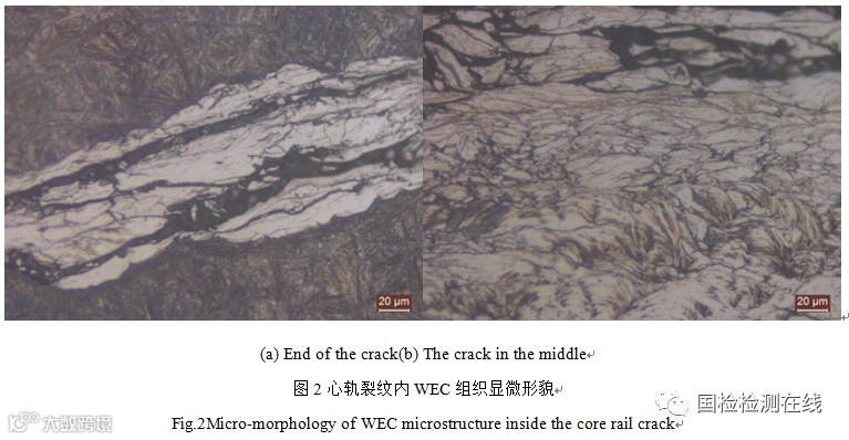 1)WEC在贝氏体钢和珠光体钢中均能产生,是铁路辙叉零件(心轨、翼轨、翼轨镶块)在滚动接触疲劳载荷作用下产生的典型组织,可作为判断是否为滚动接触疲劳失效的重要证据。
