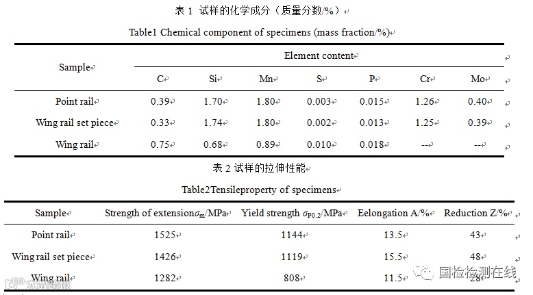 试验材料选择3件铁路辙叉常用零件:心轨(Point Rail)、翼轨镶块(Wing Rail Set Piece)、翼轨(Wing Rail)。试样的化学成分见表1,心轨和翼轨镶块均属于Si-Mn-Cr系新型贝氏体钢,前者碳含量高于后者,翼轨为U75V钢,其碳含量接近共析点,为珠光体钢,以上3种零件均为正火态下使用。拉伸性能见表2,3种材料的强度均超过1200MPa,属于高强度钢,心轨和翼轨镶块的强韧性均高于翼轨。3种试验材料均用于同一条重载铁道线路,服役时间心轨4个月,翼轨镶块和翼轨均为10个月,心轨和翼轨镶块经超声波例行检查,发现内部核伤尺寸超标下道,翼轨因断裂下道。