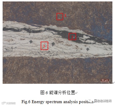 采用线切割进行试样缺陷部位金相截取,对截取的试样进行磨制、抛光,抛光面采用4%硝酸酒精溶液浸蚀,光学金相组织表征采用显微镜,电子金相组织表征采用扫描电子显微镜,能谱分析采用能谱仪,显微硬度分析采用显微硬度计(试验载荷300g,保载时间10s)。