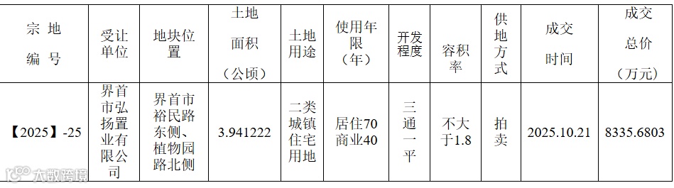 根据界自然资公告字﹝2025﹞17号公告之规定,我局于2025年9月28日至2025年10月21日通过拍卖方式成交一宗国有建设用地使用权。现将成交结果予以公示: