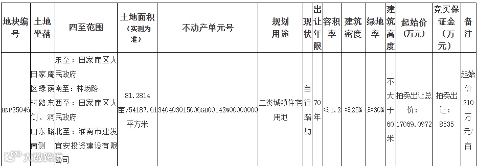 近日,淮南市土地市场迎来一则重磅消息——淮南市自然资源和规划局发布公告,以拍卖方式出让一宗优质城镇住宅用地。这宗编号为HNP25046的地块,位于田家庵区绿荫村路东侧、洞山东路南侧,土地面积达81.2814亩(约54187.61平方米),起始总价高达17069.0972万元,竞买保证金为8535万元,起始单价为210万元/亩。这一地块的入市,不仅为淮南住宅用地供应注入新活力,更凸显了田家庵区作为城市核心区域的发展潜力。