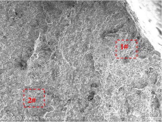 图4所示为第一扣螺纹低倍形貌,靠近螺纹表面区域标记为1#,远离螺纹表面区域标记为2#,分别进行能谱分析。