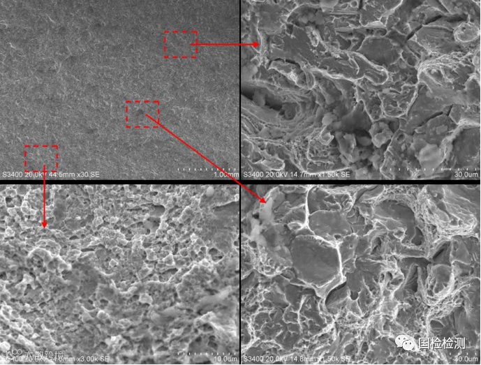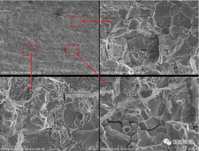 图8所示为C区微观形貌,边缘区域可见韧窝形貌,远离边缘的区域可见准解理形貌+少量韧窝+少量沿晶形貌。