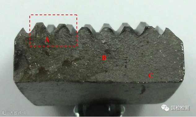 图2所示为试样断口宏观形貌,断口附近未发现明显的塑性变形,断面平整,可见明显的放射状条纹,条纹起始于断口左侧两扣螺纹(红框所示)。断面存在轻微锈蚀痕迹,未发现明显的挤压磨损现象。将断面分为A、B、C三个区域进一步描述。