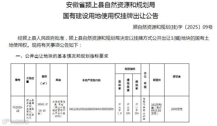 2025年9月3日,颍上县自然资源和规划局发布一则土地挂牌公告,编号YS2025-28的地块正式亮相。该地块位于四里湾片区核心位置,占地39.85亩,规划为二类城镇住宅用地(兼容5%商业),起始总价6415.85万元,折合单价约158万元/亩。这一动作不仅标志着颍上县2025年土地供应计划的稳步推进,更释放出城南新区扩容提质的强烈信号。结合《颍上县国土空间总体规划(2021-2035年)》和《2025年国有建设用地供应计划》两份重磅文件,我们得以窥见这片土地的潜力与颍上县未来的发展蓝图。