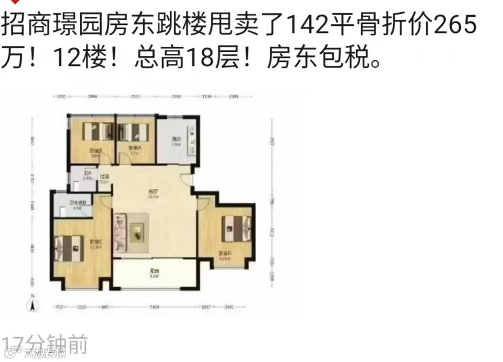 璟园一套142㎡小高层,高楼层,房东甩卖骨折价265万,折合单价仅1.8万/㎡。