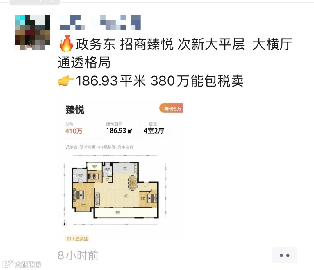 近日,有网上爆料爆出臻悦一套186.93㎡大平层,380万还包税,算了一下单价2万/㎡。